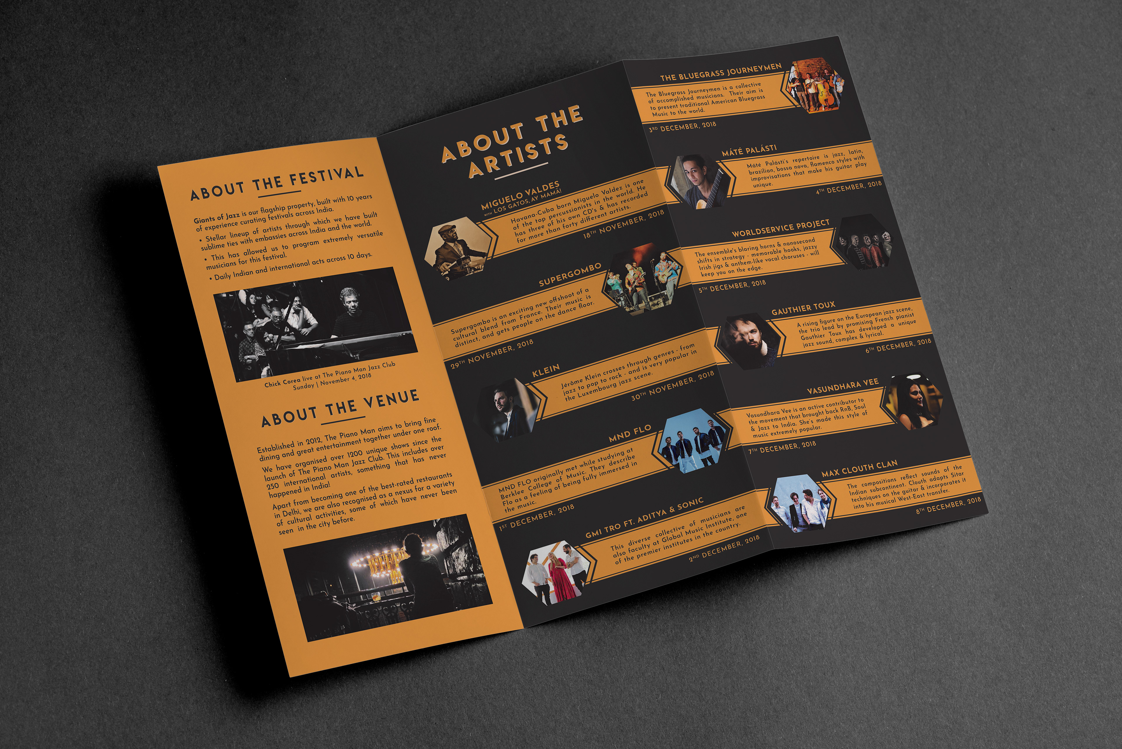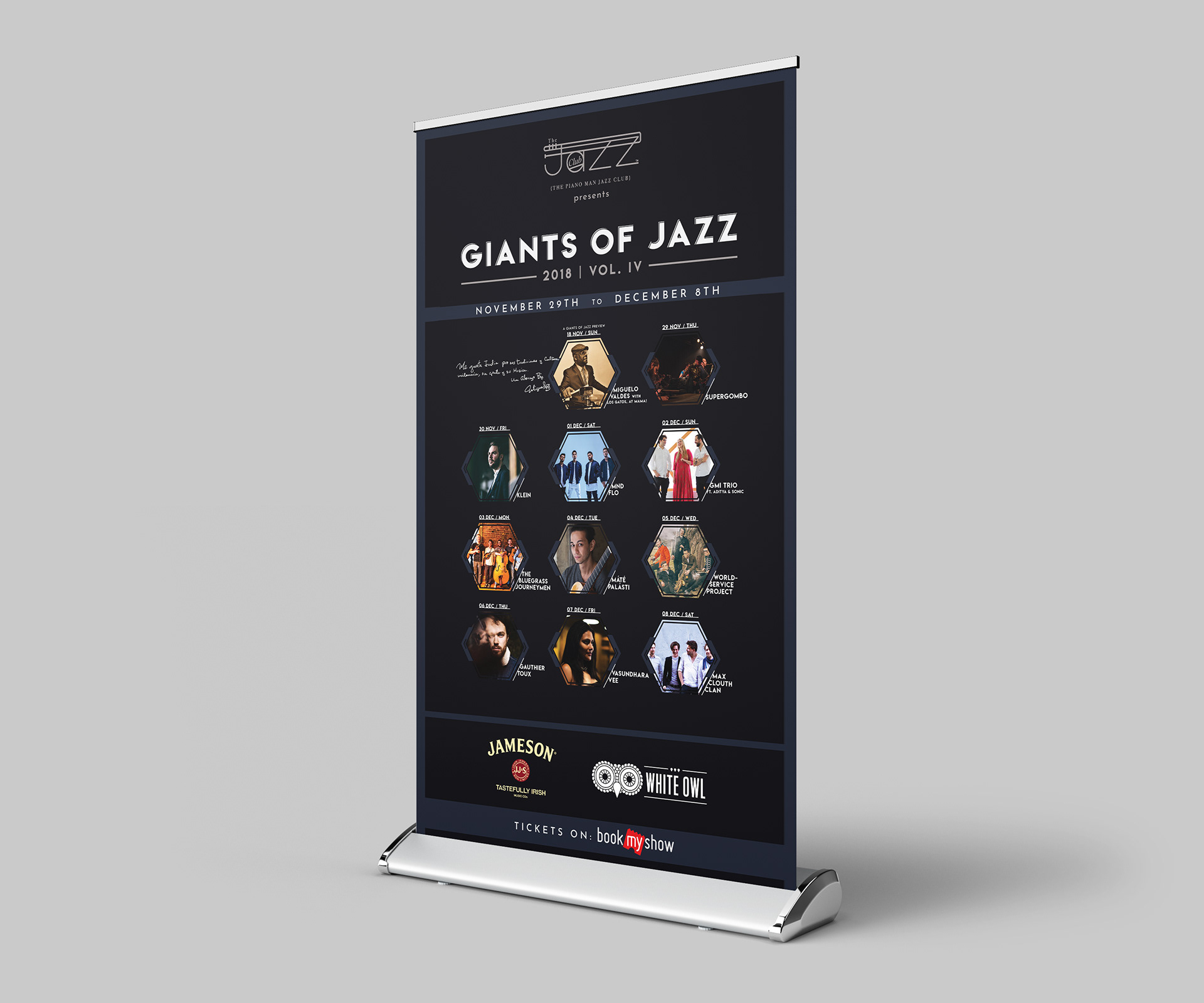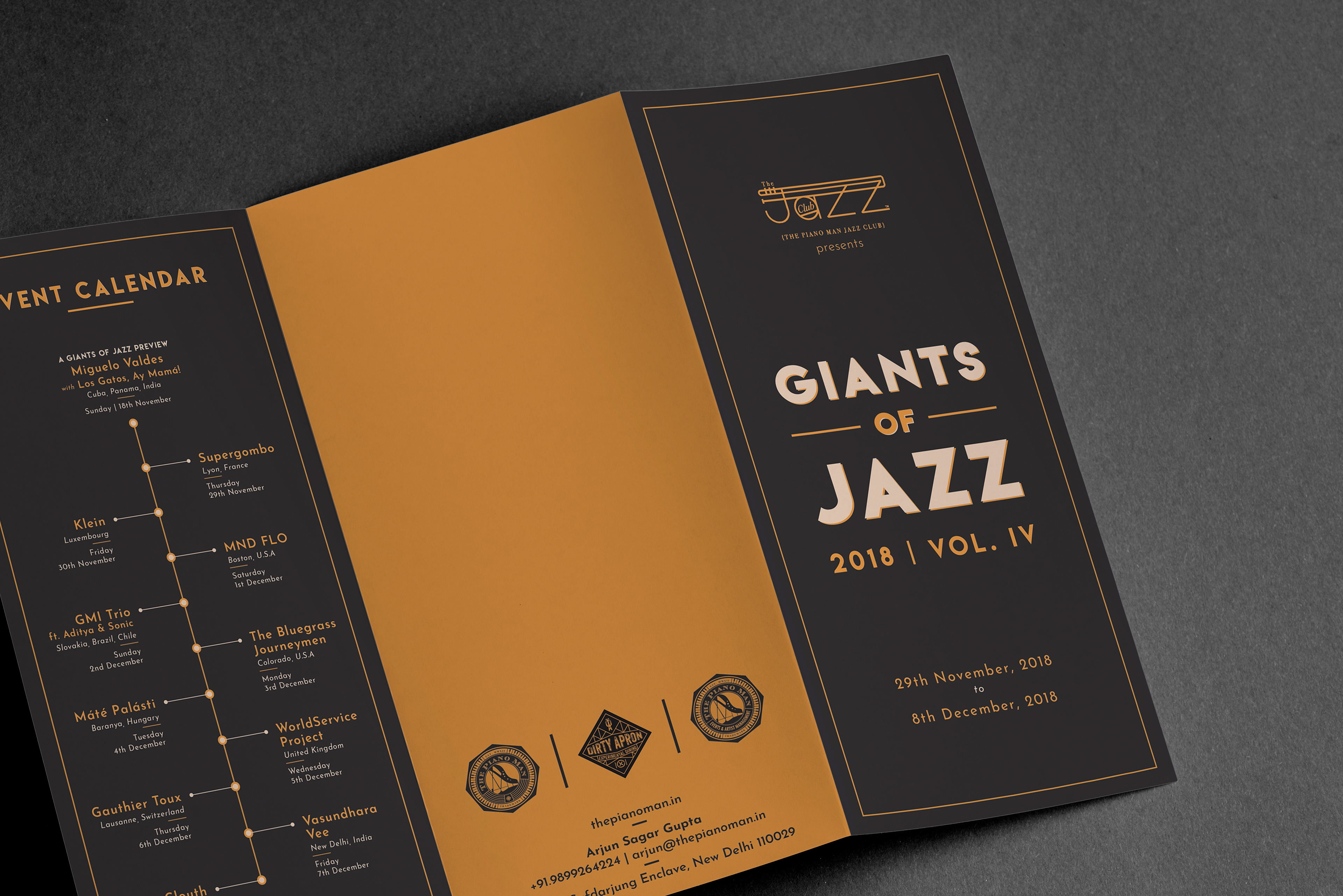 Print & digital deliverables for Giants of Jazz : Vol IV - the 4th edition of a 10 day flagship festival curated by founder Arjun Sagar Gupta, hosted annually at The Piano Man Jazz Club.